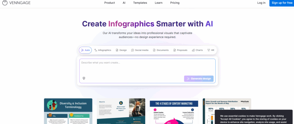 Venngage zeichnet sich durch professionelle Designqualität und Unternehmensfunktionen aus, die den Geschäftsstandards entsprechen. Über 40.000 professionelle Vorlagen, die von professionellen Designern speziell für Geschäftskommunikation, Jahresberichte, Whitepaper, Fallstudien, Angebote, Präsentationen, Geschäftspläne und Marketingmaterialien entworfen wurden. Die Designqualität übertrifft typische benutzergenerierte Vorlagen mit korrekter Typografie, Informationshierarchie und visueller Ausgewogenheit. Der KI-gestützte Infografik-Generator erstellt professionelle Designs aus Textvorgaben und versteht dabei die Anforderungen der Geschäftskommunikation. Datenvisualisierungstools importieren aus CSV- und Excel-Dateien und erstellen Geschäftsdiagramme, Finanzdiagramme, Organigramme, Zeitachsen, Prozessdiagramme und Vergleichstabellen.