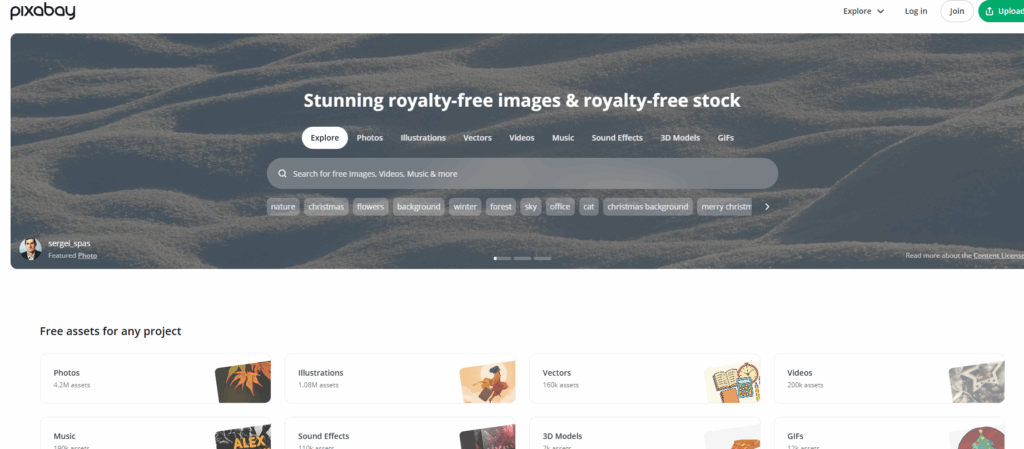 Pixabay zeichnet sich durch seine umfassenden Inhaltstypen aus, darunter Musik und Soundeffekte neben Fotos und Videos, was unter kostenlosen Stock-Websites selten ist. 4,5 Millionen Bilder, Videos, Musiktitel und Soundeffekte – komplett kostenlos. Eine Musik- und Soundeffekt-Bibliothek bietet kostenlose Audiodateien für Videoprojekte, sodass keine separaten Audioquellen mehr benötigt werden. Neben traditionellen Fotos und Illustrationen sind auch KI-generierte Bilder verfügbar. Die Pixabay-Lizenz erlaubt die kommerzielle Nutzung ohne Namensnennung oder Registrierung, die einfachste Lizenzierung, die es gibt, und vermeidet Verwirrung. Für das Herunterladen ist kein Konto nötig, man besucht einfach die Website, sucht nach Inhalten und kann sie sofort ohne Anmeldung herunterladen.