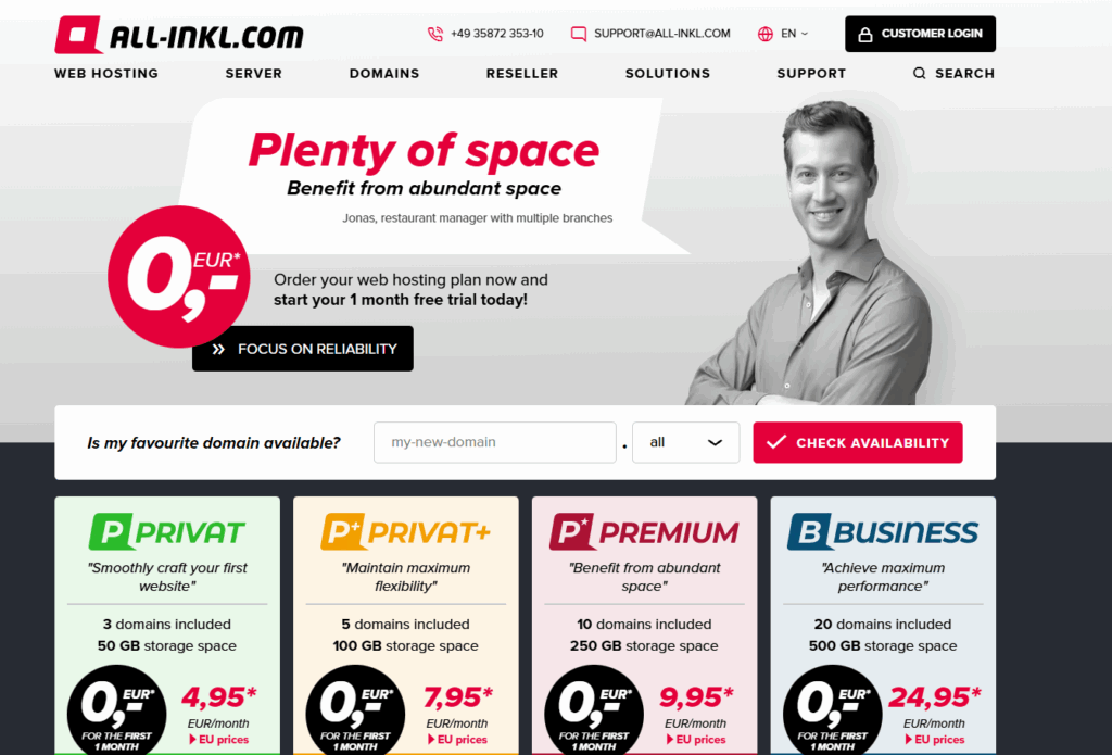 ALL-INKL ist bei Agenturen und KMUs wegen seines zuverlässigen Shared Hostings mit mehreren enthaltenen Domains, Let’s Encrypt und reaktionsschnellen Support beliebt. SSH ist in höheren Angeboten verfügbar, und die faire Ressourcenzuteilung eignet sich für viele WordPress-Websites. Flexible monatliche Laufzeiten und ein kostenloser erster Monat helfen dabei, Projekte ohne lange Verpflichtungen oder Risiken zu starten.